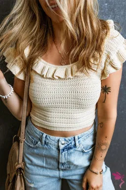 Beige Ruffled Neckline Knitted Short Sleeve Crop Top